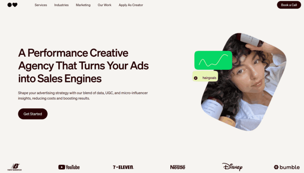 If influencer marketing plays a role in your strategy, your agency needs more than a contact list. Ask how they source talent, negotiate usage rights, and measure creator-driven performance. Top agencies run structured UGC programs, test hooks with creators, and repurpose winning content across paid.