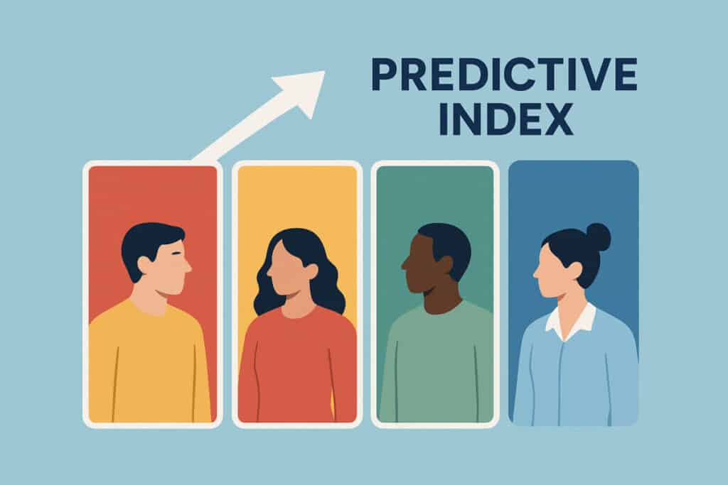 Predictive Index is a six-minute adjective checklist that scores Dominance, Extraversion, Patience, and Formality, then maps the collective style to a declared business objective.