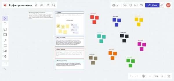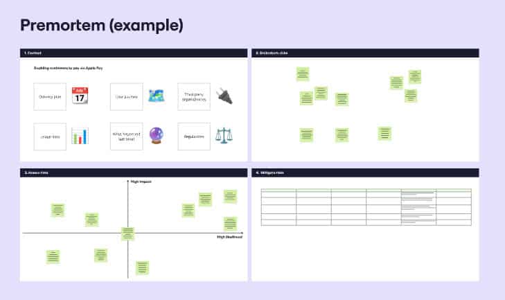 Mural is a digital workspace that enables teams to think and collaborate visually. This template will help you facilitate premortem sessions, brainstorm potential project risks, and align your team on solutions โ€” all in one shared, interactive space.