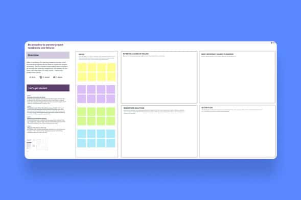 The objective of this Miro template is to identify potential pitfalls in the next project cycle, establish a clear, actionable plan for the most likely ones, and help teams proactively reduce risk.