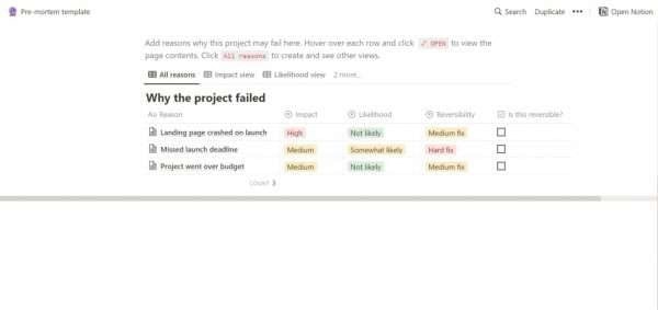 The Notion pre-mortem template is a flexible, document-based option ideal for risk documentation and contingency planning. It allows teams to capture potential failure points, assign owners, and build out a clear action plan that can be updated and referenced as the project progresses.