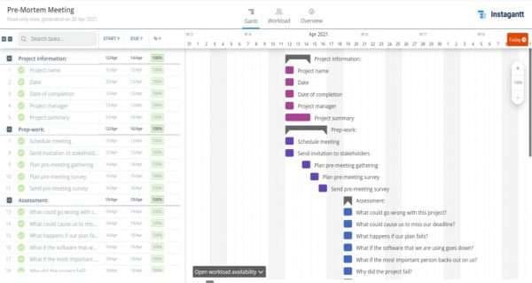 The Instagantt pre-mortem template is a powerful online tool that supports the full pre-mortem process โ€” from planning and conducting the session to storing and organising the information gathered so it can be easily reviewed and referenced throughout the project lifecycle.