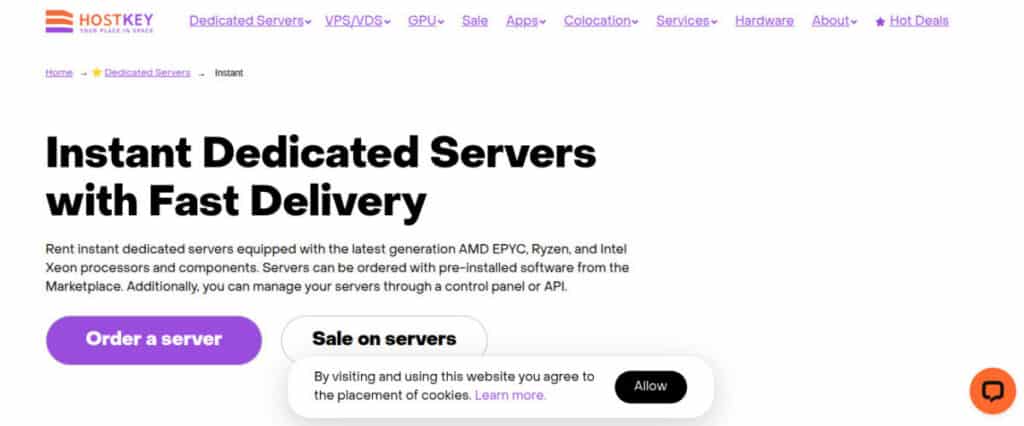 HOSTKEY offers instant dedicated servers equipped with AMD EPYC, Ryzen, and Intel Xeon processors. Servers come in fixed configurations from their pre-staged inventory and can be ordered with pre-installed software from their marketplace. Custom configurations are available through a separate online configurator, but take longer.