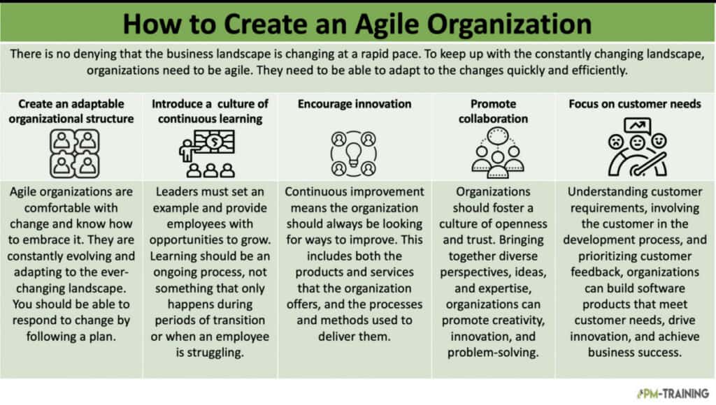 Agile organizations are not defined by the tools they use or the frameworks they follow. They are defined by their commitment to adaptability, collaboration, and continuous delivery of value. The five practices outlined in this article provide a clear starting point for any organization seeking to build genuine agility into its structure and culture. From fostering continuous learning to centering every decision around customer needs, each practice reinforces the others and contributes to a more resilient and responsive organization.