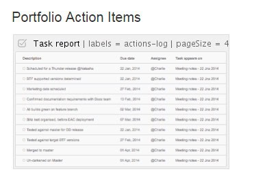 When you save the page, the list of open action items from all the projects in the Confluence space with the ‘actions-log‘ label will be displayed automatically.