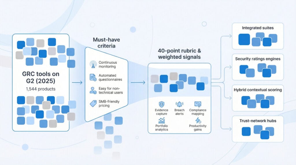 We then organized finalists by approach: integrated compliance suites, continuous ratings engines, hybrid contextual scorers, and trust-network hubs. That way, you can start with the model that fits your program today, then evaluate specific platforms inside that category. The result is a shortlist built for small teams that need to prioritize the vendors that matter, without getting stuck managing feature bloat.