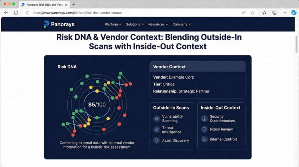 Panorays combines continuous attack-surface monitoring with vendor-provided evidence and questionnaire responses. It then fuses those inputs into its Risk DNA scoring model, which adjusts based on the context you set, such as whether a vendor processes sensitive customer data or supports a critical workflow.