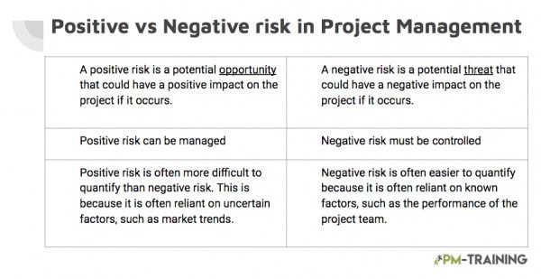 Positive risks, or opportunities, have the potential to improve project outcomes if they occur and should be actively pursued. Negative risks, or threats, have the potential to harm the project and should be minimized or mitigated. Both require structured management, but the strategies and responses applied to each are fundamentally different.