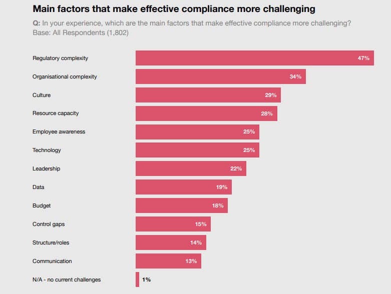 Legal and compliance requirements are one of the most common reasons businesses get stuck. Unlike internal issues that managers can control directly, compliance often comes with strict external rules that cannot be ignored. Recent research from PwC shows that 47% of companies see regulatory complexity as their biggest compliance challenge, while 34% point to organizational complexity and 29% to company culture.