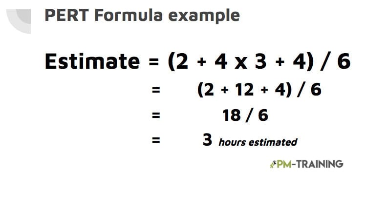 - Using the PERT formula,ย you would first come up with an optimistic estimate (2 hours), a pessimistic estimate (4 hours), and a most likely estimate (3 hours).ย