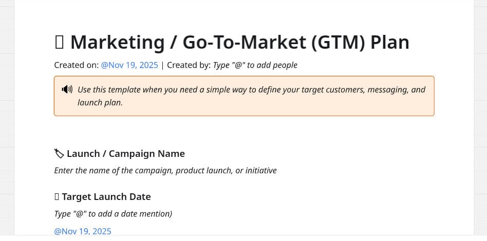 Product marketing projects involve a specific set of recurring activities, from market research and positioning to launch logistics and performance tracking. A dedicated product marketing plan template standardizes these activities, ensuring that every launch follows a proven process and that nothing falls through the cracks between campaigns.