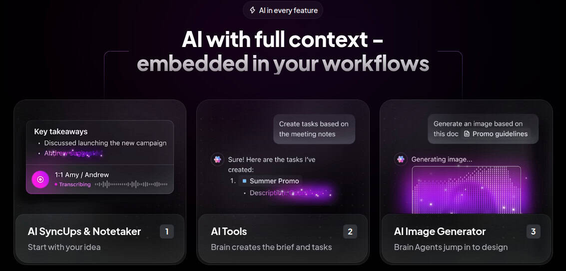 - AI Project Management: Brain automatically creates tasks from chats, assigns owners, sets priorities, tracks milestones, and monitors timelines without manual input.