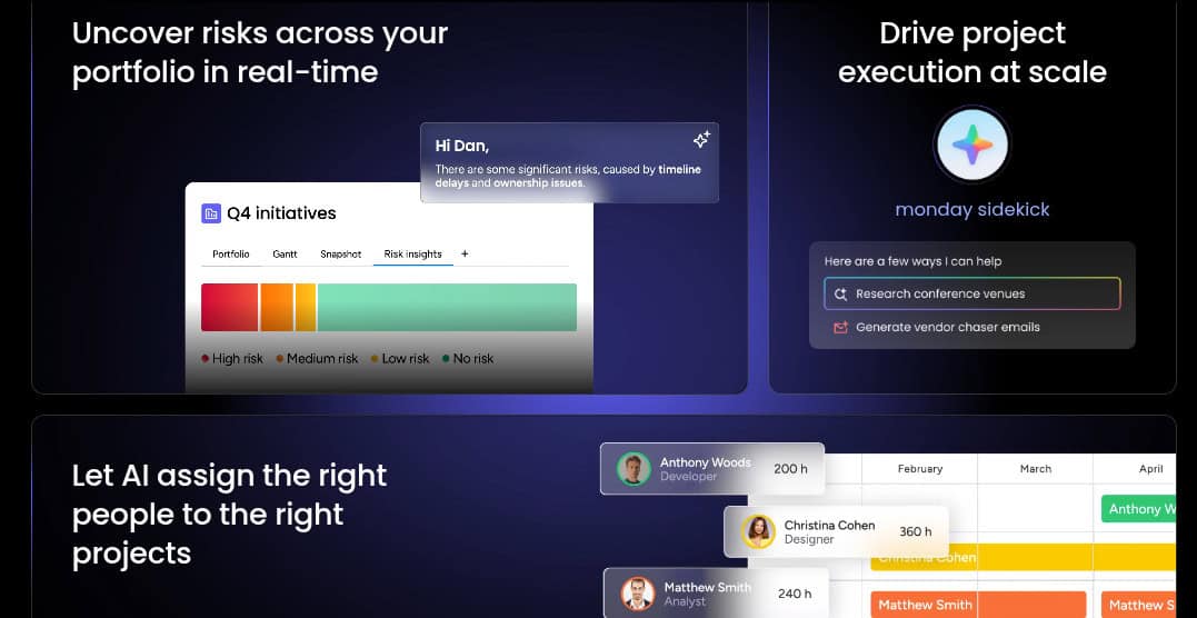 What differentiates monday.com is its growing suite of AI assistants, including project assistants, service agents, SDR experts, scrum masters, and competitive analysis tools. These assistants can automate repetitive actions, triage requests, assign tasks, guide sprints, and generate insightsโreducing manual effort and accelerating execution at scale.