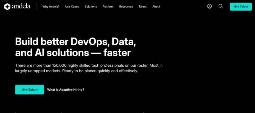 Best for building dedicated, cost-effective remote engineering teams. Andela connects companies with pre-vetted, remote software engineers primarily from high-growth tech markets. They are a premier partner for building distributed development teams, offering a seamless remote-first model. Their approach provides access to deep talent pools, enabling scalable and cost-effective engineering resourcing for long-term projects.