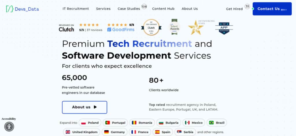 Best for custom, technically complex hiring needs. DevsData is a specialized tech recruitment firm focused on solving unusually complex or niche hiring challenges. They go beyond standard recruiting with an intensely hands-on, consultative approach. Their rigorous technical screening and deep collaboration ensure they find candidates who precisely fit your project’s unique technical requirements and team dynamics.