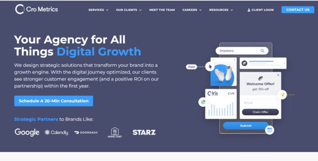 Cro Metrics, based in California, is known for embedding with product and marketing teams to run continuous testing. Theyโve worked across SaaS, media, and nonprofits, making them versatile.