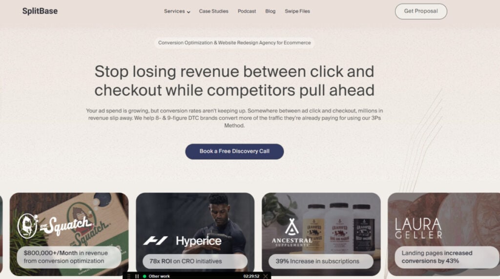 If youโre in e-commerce, SplitBase is a strong choice. Based in Montreal, they specialize in optimizing Shopify and DTC brands with a focus on conversion copywriting and design. They dig into your analytics, survey your customers, and then build experiments that connect messaging with buyer psychology.