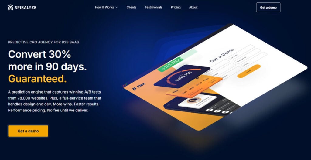 If you want a partner that only wins when you win, Spiralyze is it. Based in Atlanta, they donโt charge you a dime unless they increase your conversions. Their secret weapon is a prediction engine trained on insights from over 78,000 A/B tests. That means they already know what kinds of changes tend to deliver results.